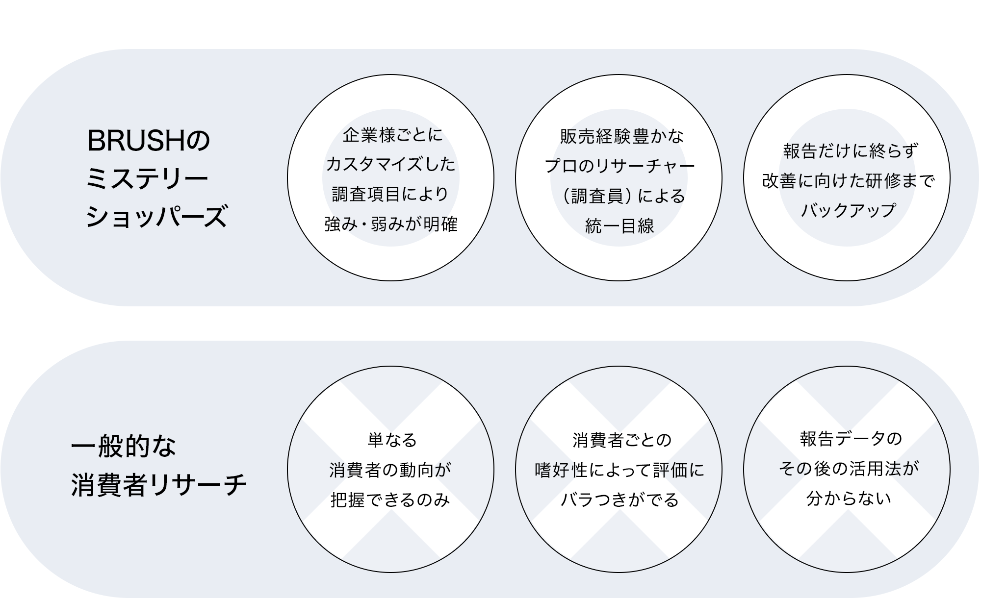 BRUSHのリサーチャー(調査員)は宝飾、化粧品、アパレルなどファッション業界での豊富な販売経験を持つ専属リサーチャ ーです。一般的な消費者リサーチにありがちな十人十色のお客様の感想をまとめるのではなく、プロの販売員がお客様の『目』と なってリサーチします。『売る側』と『買う側』双方の視点からショップを客観的に評価します。数値評価だけでなく、各ショップの 強み・弱みが具体的に発見できる精度の高い報告書に加え、改善に向けた効果的な研修のご提案もいたします。